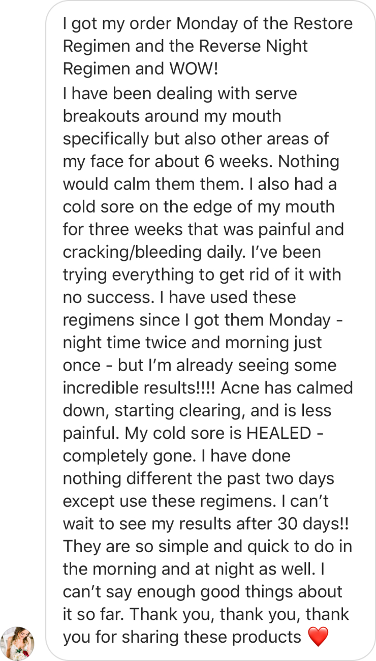 This regimen is amazing! My skin looks and feels amazing. It seems to balance my skin tone great and doesn’t make me feel dry or oily. I would highly recommend!